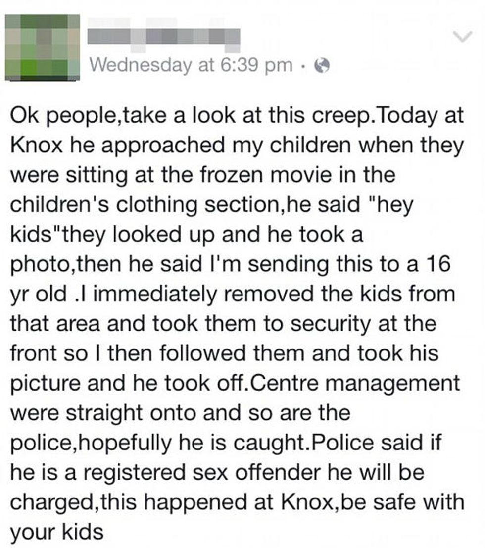 "Ok people take a look at this creep. Today at Knox he approached my children when they were sitting at the frozen movie in the children's clothing section, he said 'hey kids,' they looked up and he took a photo. Then he said I'm sending this to a 16-yr-old. I immediately removed the kids from that area and took them to security at the front so I then followed them and took his picture and he took off. Centre management were straight onto and so are the police, hopefully he is caught. Police said if he is a registered sex offender he will be charged, this happened at Knox, be safe with your kids."
