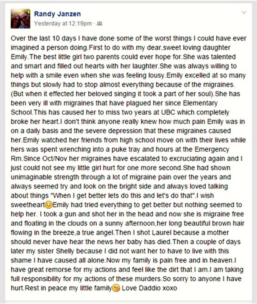 Authorities are still piecing things together, but this message on Janzen's Facebook wall — which he may or may not have actually written — lays out possible motives for all the killings.