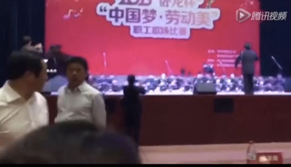 Saturday, eight members of a Chinese police choir were injured -- two of them severely -- when the stage collapsed beneath them during a rehearsal for a singing competition. And it was all captured on video.