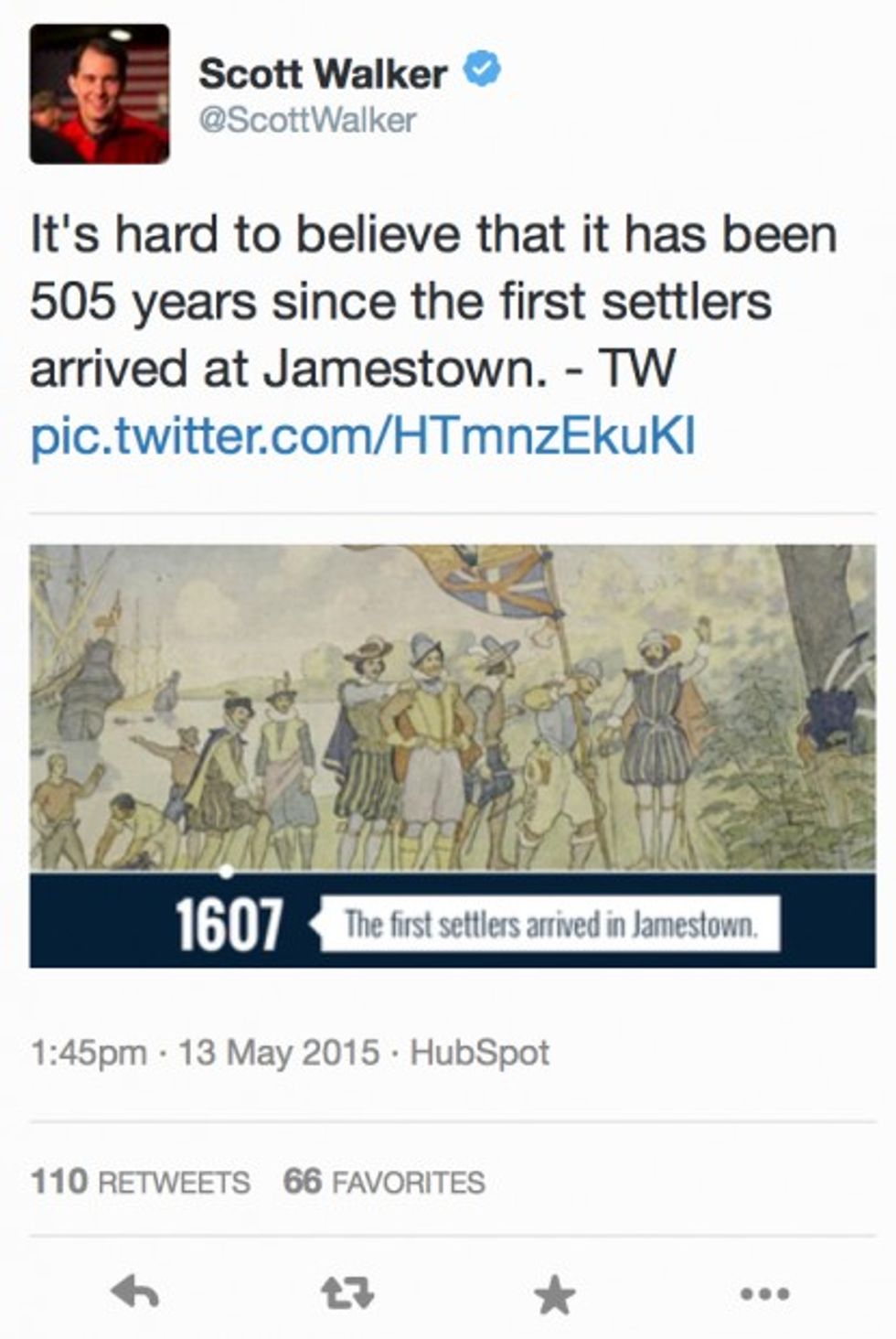 Monday afternoon, a tweet sent from Scott Walker's account (but signed "TW," indicating it wasn't the Wisconsin governor authoring it) talked about settlers arriving in Jamestown in 1607. But the write-up mentioned it happened 505 years ago. That, however, is bad math.