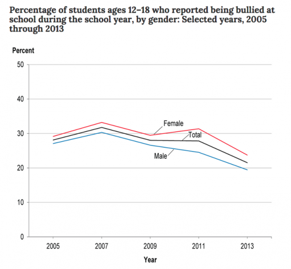 Female students have always reported more bullying than males. In 2013, 24 percent of females reported bullying, compared to 19 percent of males.