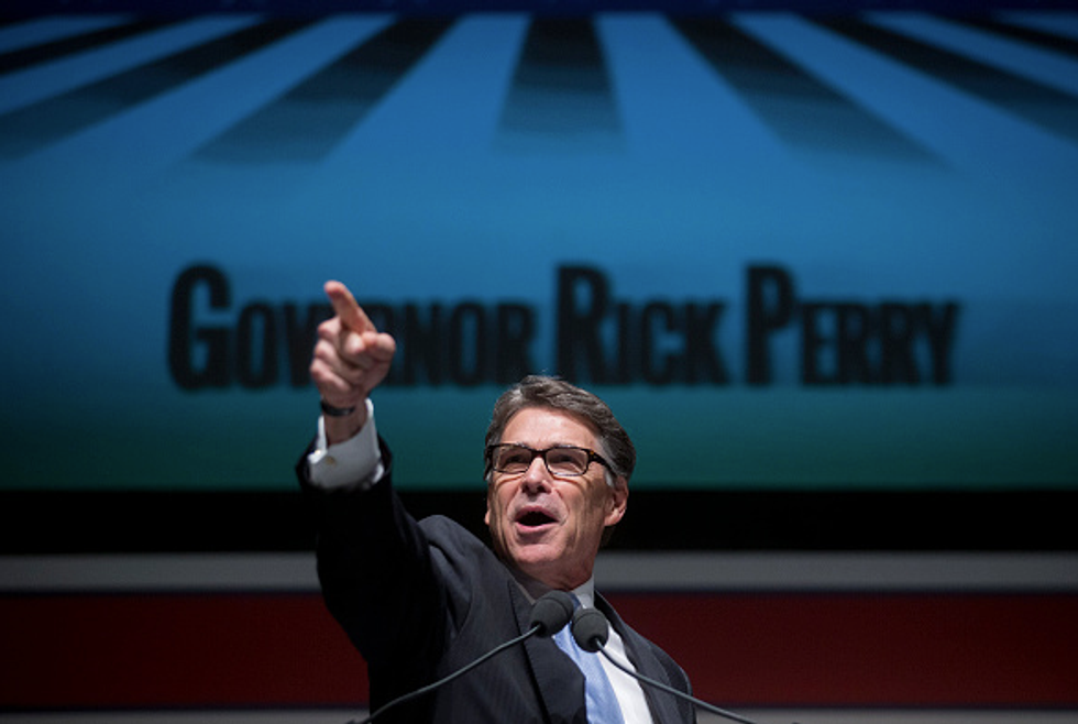 Texas Governor Rick Perry speaks to fellow Republicans during a luncheon meeting during the Republican National Committee's Annual Winter Meeting on January 16, 2015 in Coronado, California. (Image source: Sandy Huffaker/Getty Images)