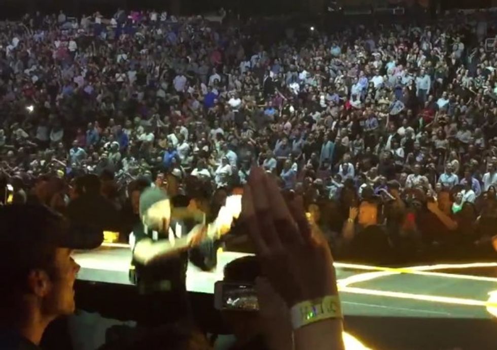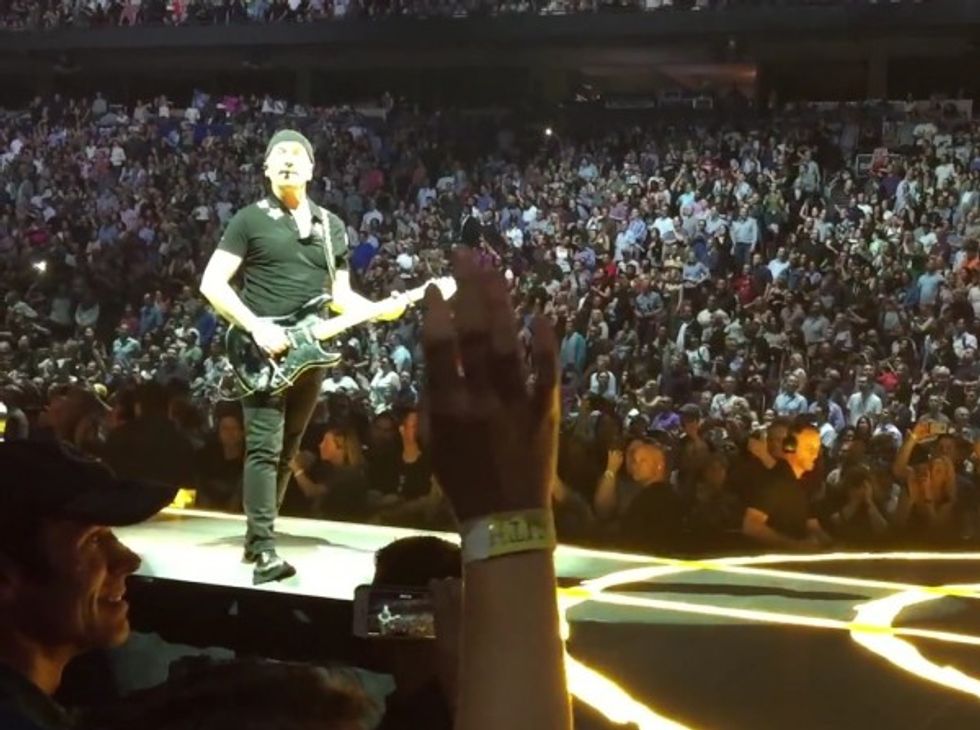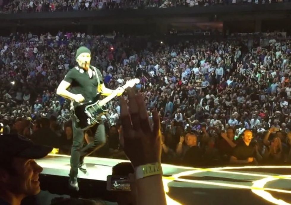 The Edge can be seen quickly springing back up with the help of concert staff and raising his arm to a cheering crowd; the group finished the song without the aid of his guitar.