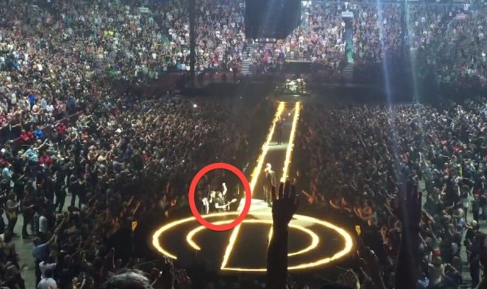 An online video apparently shot by an audience member shows the guitarist sauntering toward the lip of an illuminated catwalk during the iconic "I Still Haven't Found What I'm Looking For" — and falling straight down.