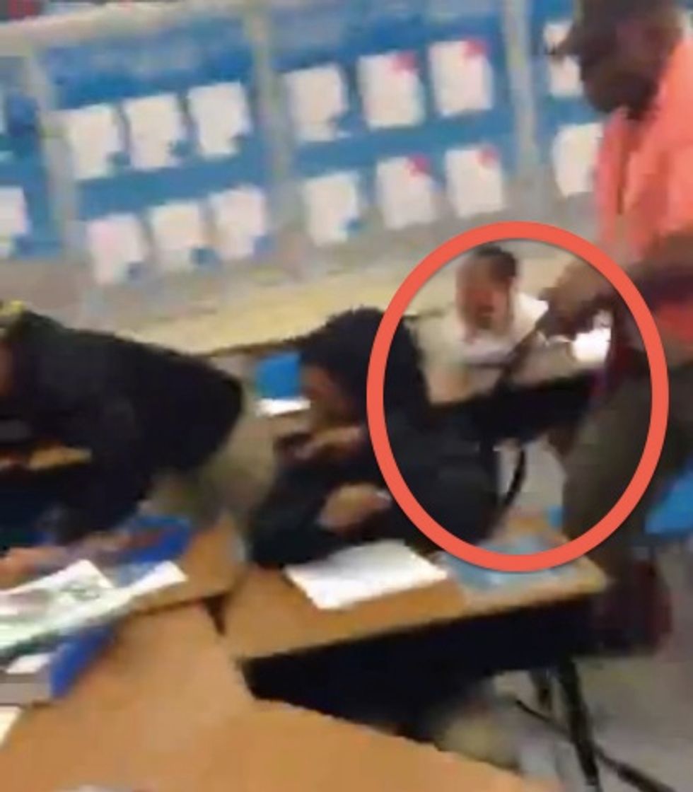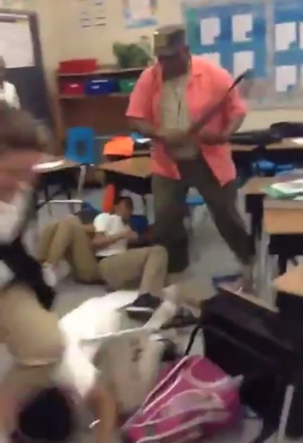As the shocked students settled down amid their completely trashed surroundings, the teacher dictated the class' obvious next order of business: "Clean this room up!"