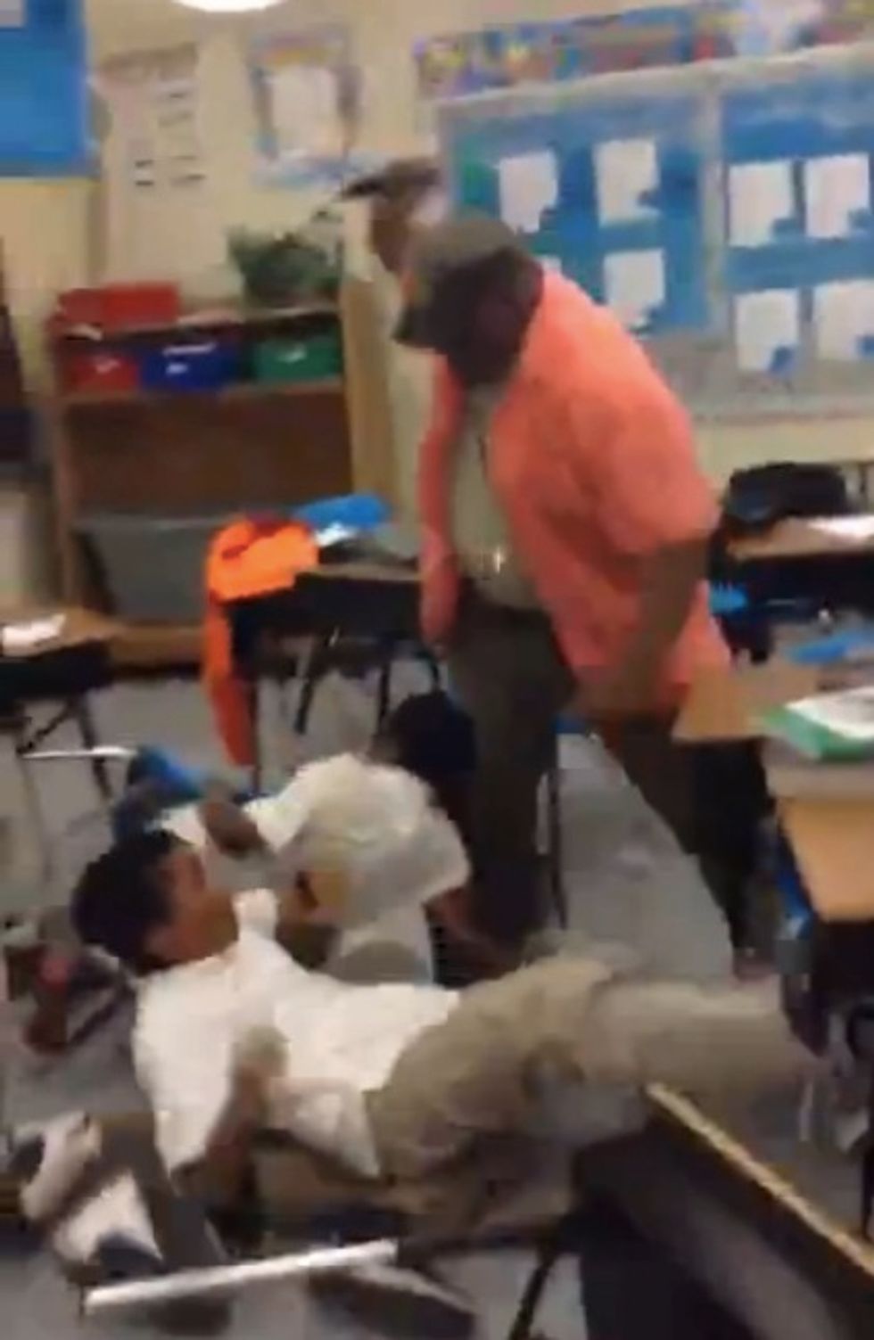 But within seconds a large man — presumably the teacher — approached the battle among four boys squirming on the floor and unleashed what appeared to be his belt.