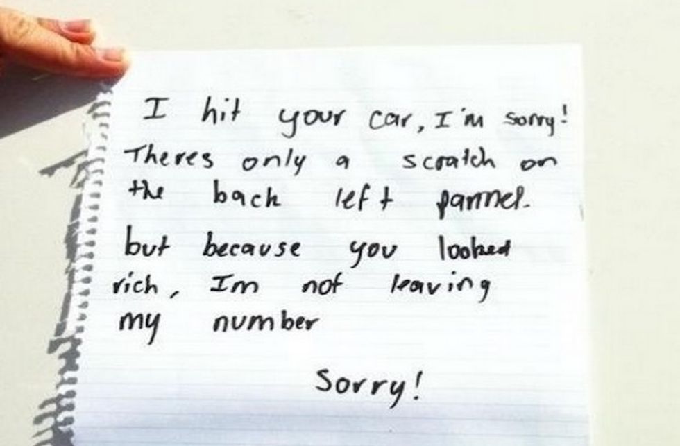 Of course, there were notes confessing to damaging a car. This one admits to scratching the car, but assumed that the victim could afford it.