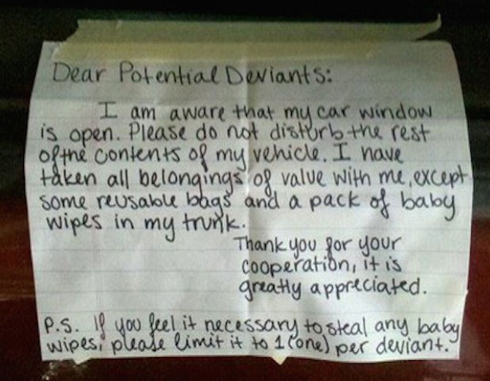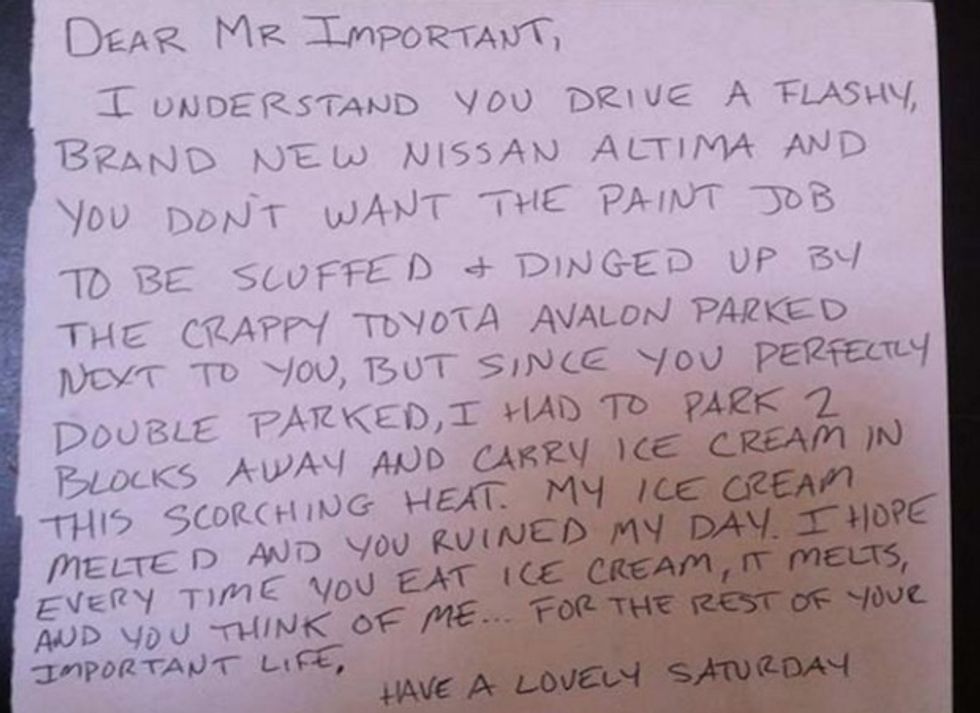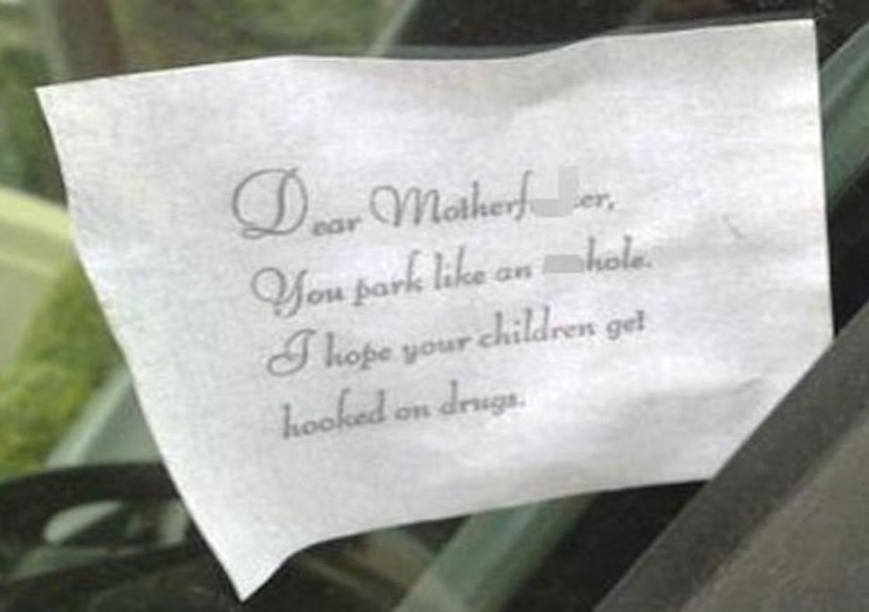 This note earns the award for "most effort needed to send a message." It required the author to write it on a computer, print it and return to leave it on the car. It also contained some cursing.
