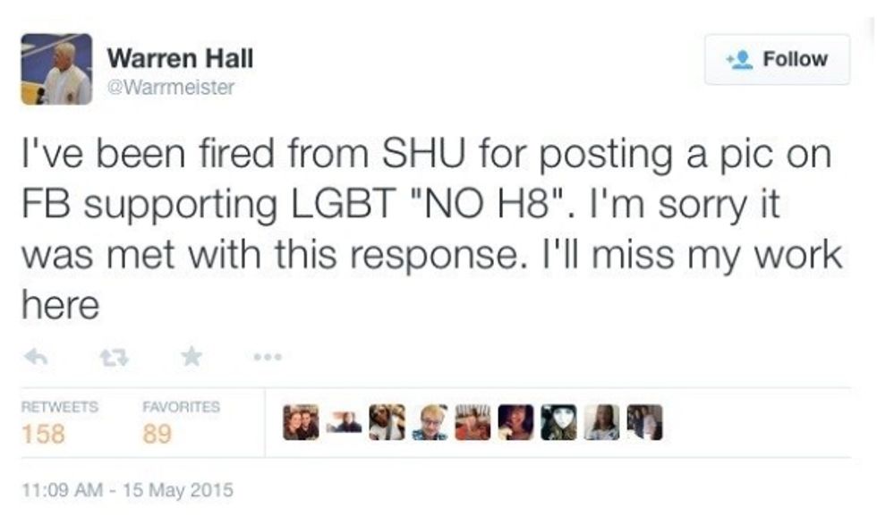 "I've been fired from SHU for posting a pic on FB supporting LGBT 'NO H8,'" Hall reportedly wrote Friday morning on Twitter before later deleting the message. "I'm sorry it was met with this response. I'll miss my work here."