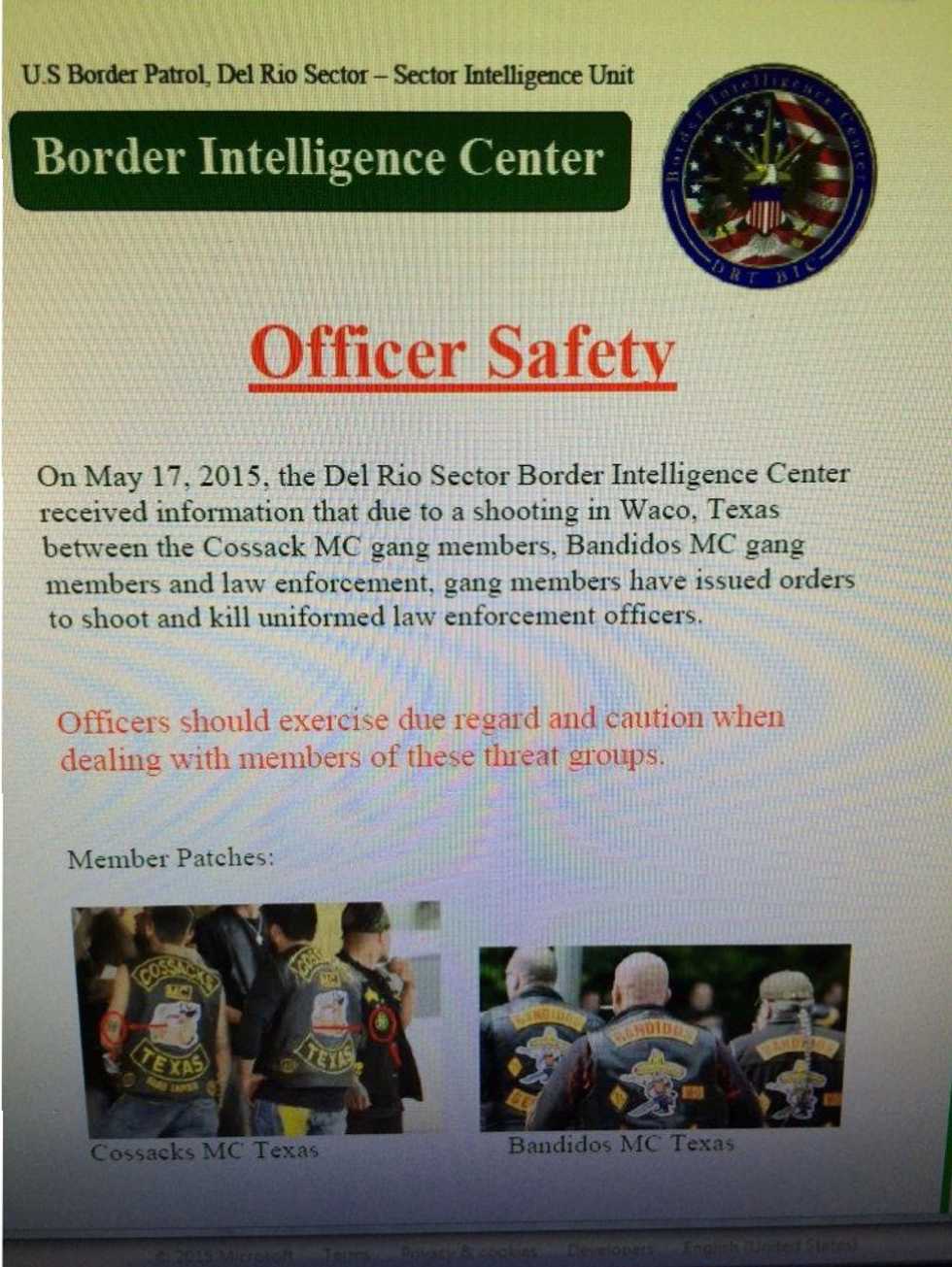 "On May 17, 2015, the Del Rio Sector Border Intelligence Center received information that due to a shooting in Waco, Texas between the Cossack MC gang members, Bandidos MC gang members and law enforcement, gang members have issued orders to shoot and kill uniformed law enforcement officers," it said.