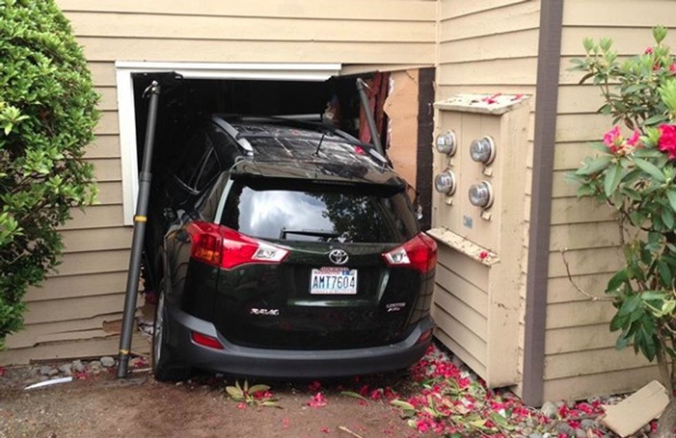 According to KOMO-TV, police in Bellevue, Washington, believe the driver who was pulling into a carport, accidentally hit the gas instead of the brake, jumping a curb and plowing into an apartment building. Police told the news station the woman's husband was teaching her how to drive at the time.