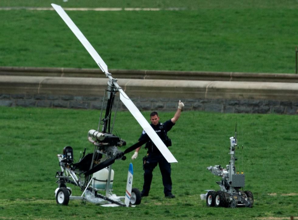 A Capitol Police officer flashes a thumbs up after inspecting the small helicopter a man landed on the West Lawn of the Capitol in Washington, Wednesday, April 15, 2015. (AP Photo/Manuel Balce Ceneta)