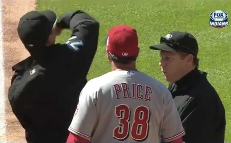 Price was thrown out by crew chief Jim Reynolds after the lineup cards were exchanged. The two had a lengthy heated argument that continued as the Indians players took the field.