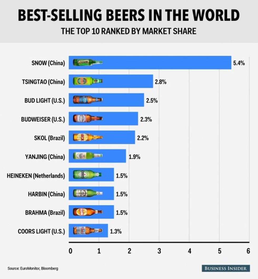 Chinese brands have a firm grasp on the world's most popular beers, with four of the top 10 global beers calling China home, according to a Bloomberg roundup published this week.