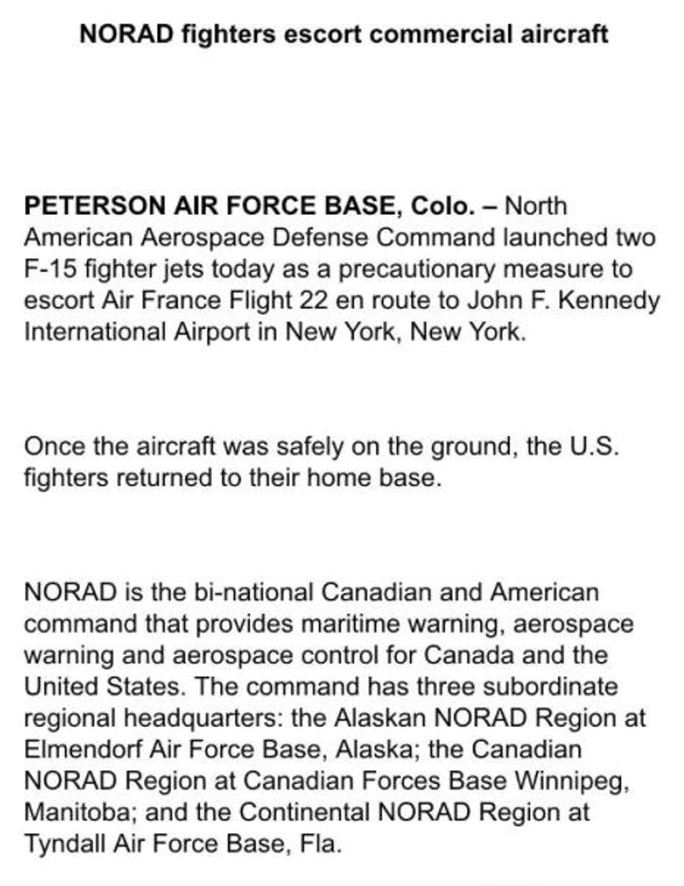 "Out of an abundance of caution, Air France flight number 22 was escorted to John F. Kennedy airport by U.S. Air Force fighter jets following a phone threat," the FBI said in a statement. "There were no incidents or hazards reported on board the flight by either the passengers or its crew. The plane has been cleared."