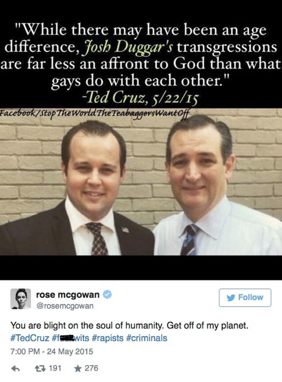 The made-up quote McGowan posted is part of meme from the website "Stop the World, the Teabaggers Want to Get Off," and includes a photo of Cruz standing next to Josh Duggar, who has apologized for “teenage mistakes” connected to decade-old child molestation charges.