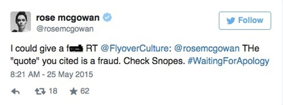 The next morning, after having been hit with responses letting her know she was spreading a falsehood about Cruz, a profane McGowan at first appeared defiant: