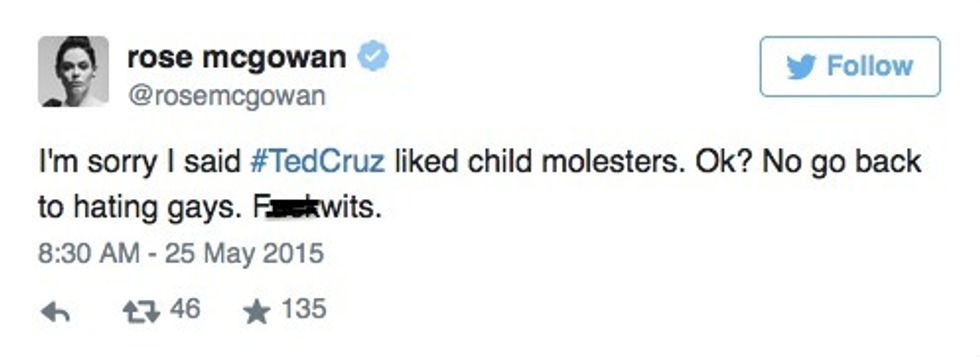 "I’m sorry I said #TedCruz liked child molesters. OK?" McGowan finally tweeted. "No (sic) go back to hating gays ..."