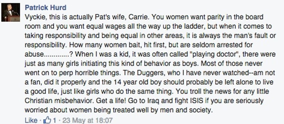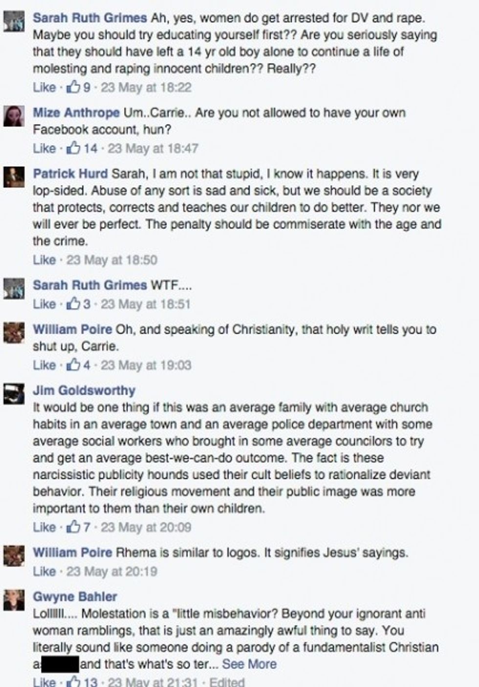 On Facebook, Hurd used her husband's account to fire off a response to a friend who had posted an article labeling the Quiverfull movement a "Christian cult" that taught the Duggars to blame girls for being molested.
