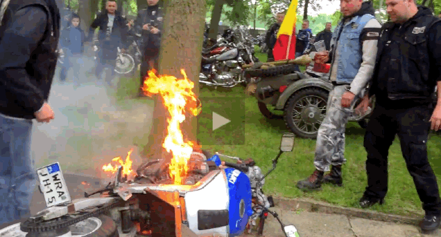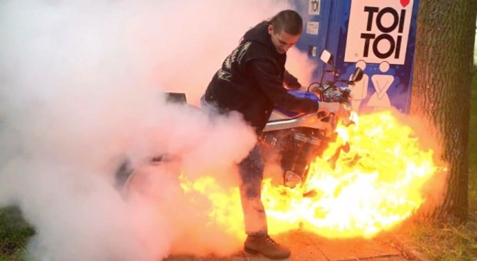 Ultimately, the fire was put out. No one appeared to be injured. According to the YouTube description, individuals at the bike show donated about half of what it will cost to fix the bike.