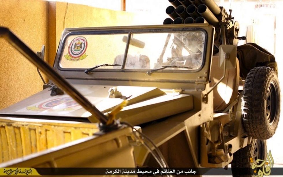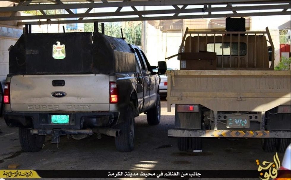 The Islamic State group released a new video showing off the vast amounts of military equipment it has plundered from the Iraqi army in the Fallujah area, including vehicles, machine guns, ammunition, mortars and grenades.