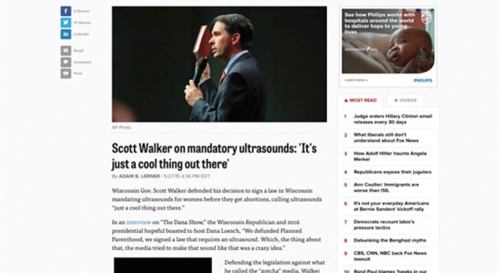 Politico ended up changing the headline to a tamer one. It now reads: "Scott Walker defends mandatory ultrasounds." At the time of publication, the Huffington Post and Jezebel were still attributing Walker's "cool thing" line to forced ultrasounds.