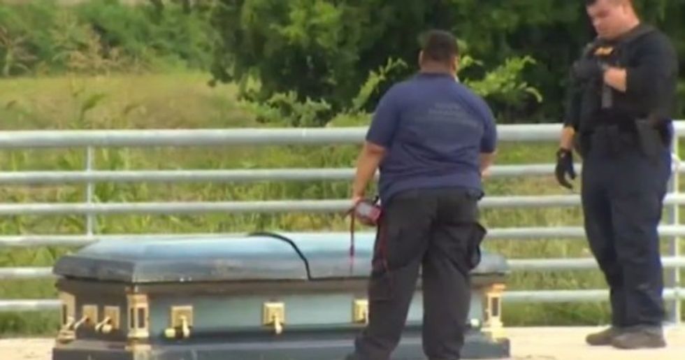 According to KHOU-TV, Houston police were called and guarded the casket that was about 100 yards from the cemetery, which has been in use since 1889. The news station reported that the medical examiner is required to identify the remains and notify family members before the casket can be buried again.