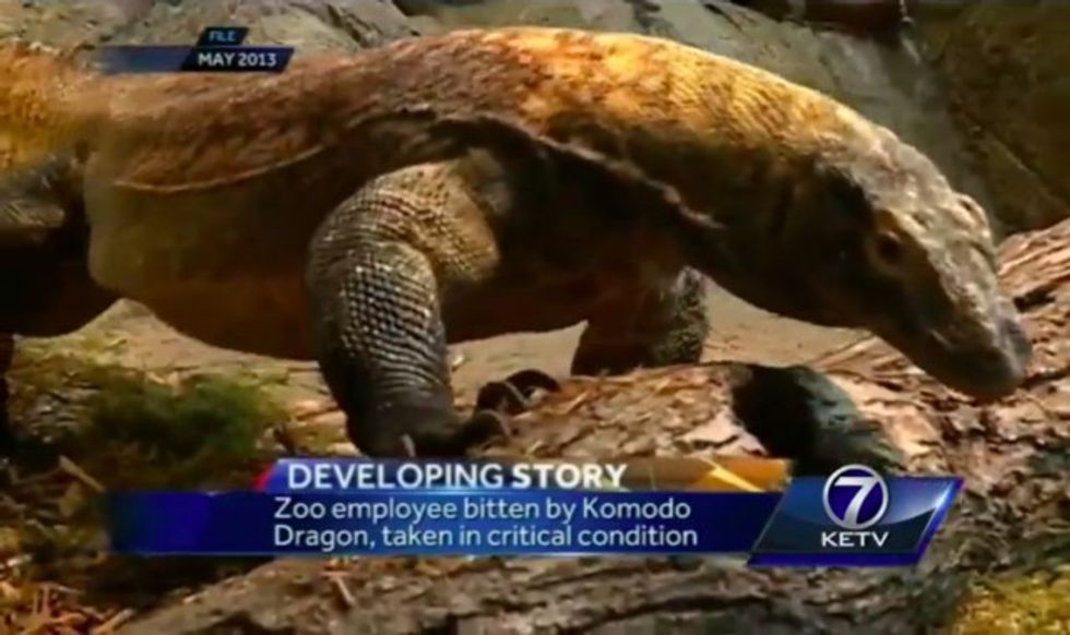The zookeeper was bitten in the hand by the lethal lizard while performing routine animal care at the Henry Doorly Zoo and Aquarium, KETV-TV reported. She was transported to a hospital in critical condition, the station said, but was soon stitched up and given antibiotics.