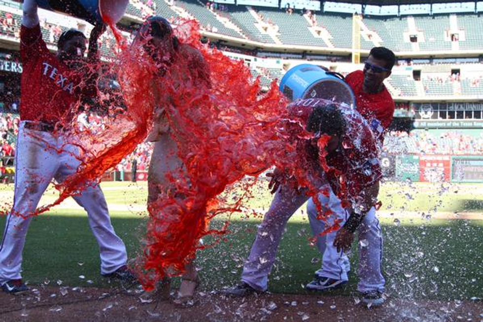 After the game, Hamilton was speaking with Fox Sports reporter Emily Jones when he spotted teammates Elvis Andrus and Robinson Chirinos sneaking up on him with large containers of Powerade.