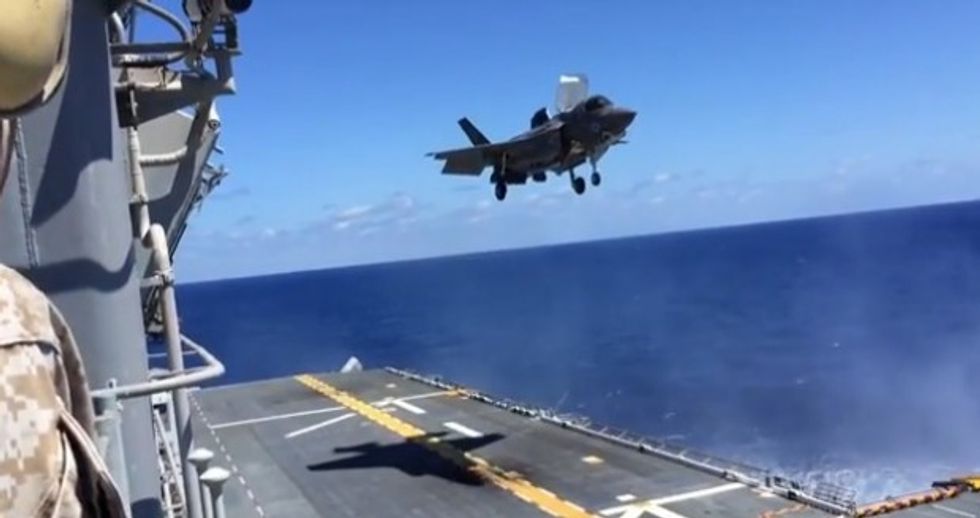 Butler's video is about eight minutes long, but it features the plane's short takeoff capability (around 2:10) and a stunning vertical landing (starting around 3:00). Then there's a bit of a lull in the action until around 6:10 when another F-35B comes in for a vertical landing and then pulls forward to take off only a couple of minutes later.