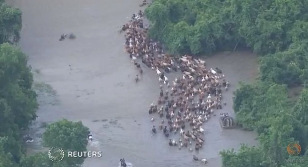 Watch this aerial footage of the cattle making their way across the swollen waterway: