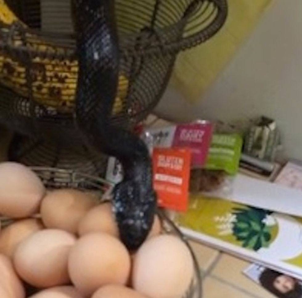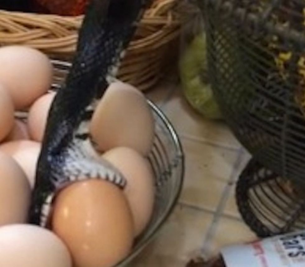 "[...] a noise in the kitchen made us look up...at the spice cabinet...where THIS was descending toward a basket of fresh eggs on the counter...!" Neff wrote in a description of the video posted to YouTube.