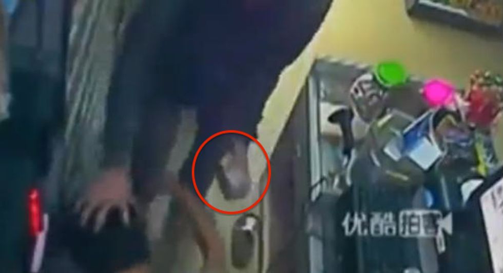 The United Kingdom's Daily Mirror reported the incident is believed to have occurred in Schenzen, China, after a shopkeeper dozed off when he was supposed to be working. The robber approaches the sleeping employee from behind the counter and hits him violently several times in the head.