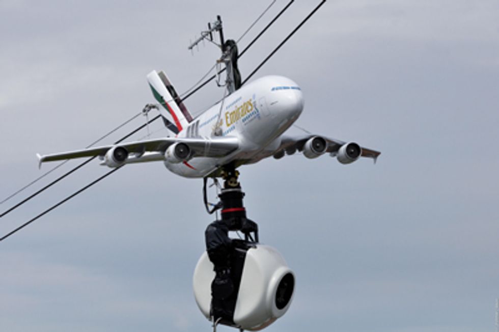 It was a robotic camera, rigged to fly over the stadium on wires, and mounted on a model of sponsor Emirates Airline's A380 aircraft. At about 150 feet above the ground, the shadows from the wires don't show up.