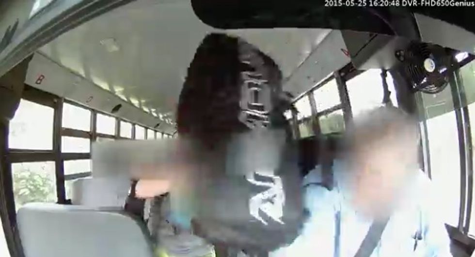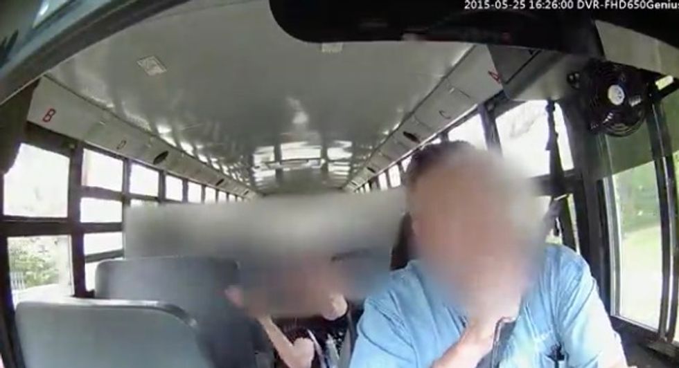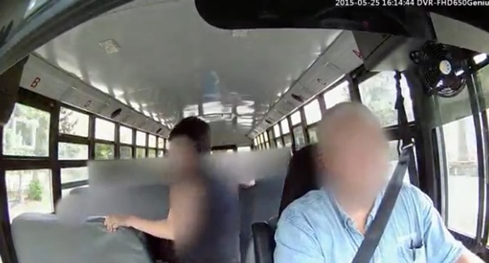 The seventh grade boy moved over to the younger child's seat and the pair appeared to squabble for a moment until the driver ordered the seventh grader back to his own seat. After the younger boy got in a sneaky hit in retaliation, the older boy appeared to speak animatedly and gave him the middle finger.