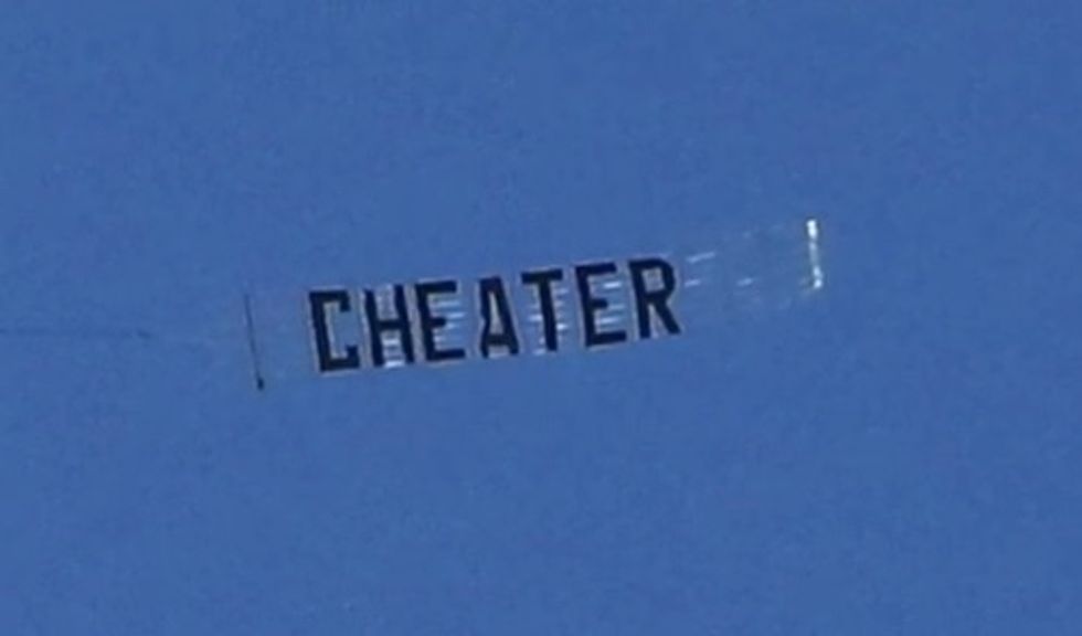 But as it was all happening, a few people in the crowd noticed something strange. Flying overhead, a large banner pulled by a small, low-flying, plane read, "Cheater."