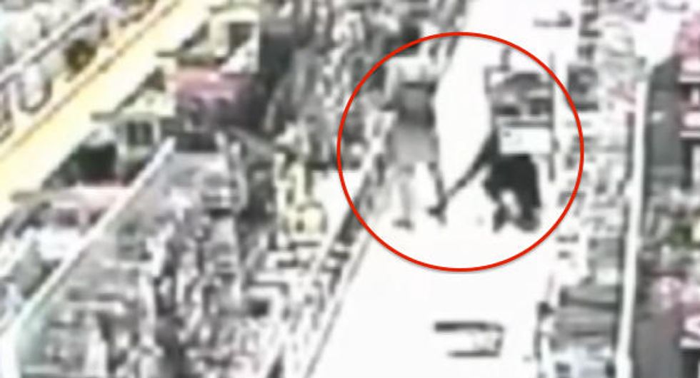 The woman suddenly turns around and the suspect bolts. Police said he left in a gold Ford F-150 truck. Other surveillance video captured an image of him walking out of the store.
