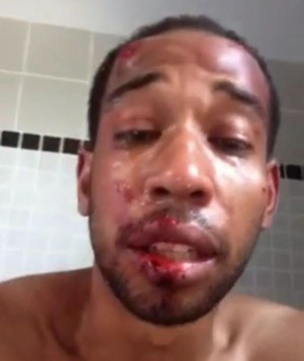 "This is what they did to me," he said, pointing to cuts and bruises on his face and arms and back.
