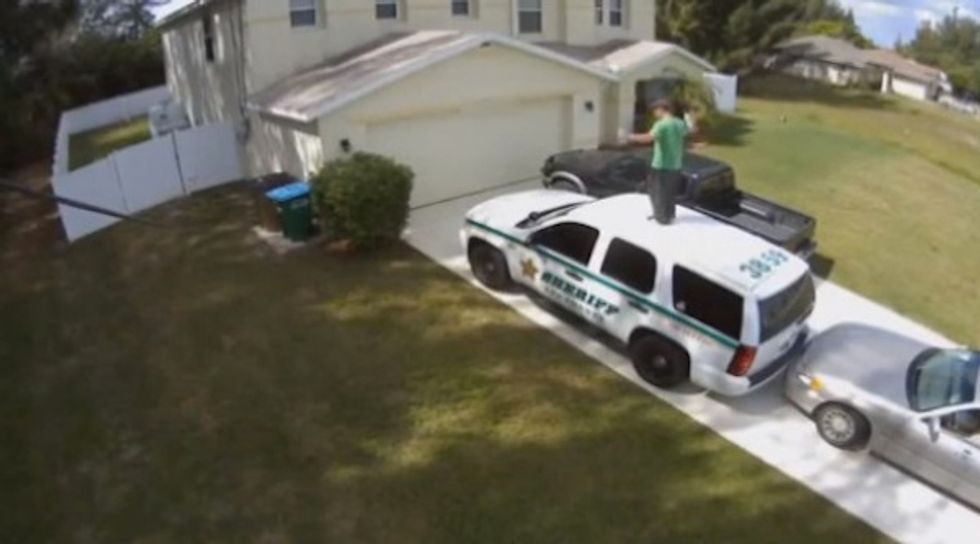 The incident on the Lee County Sheriff's Office SUV happened in early April, but video was released just this week. It shows a man, later identified as 44-year-old Christian Radecki, dancing on top of the vehicle as music from his own car blared in the background. The man, after several minutes of dancing proceeds to take an American flag from a neighbor's yard.