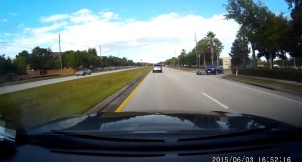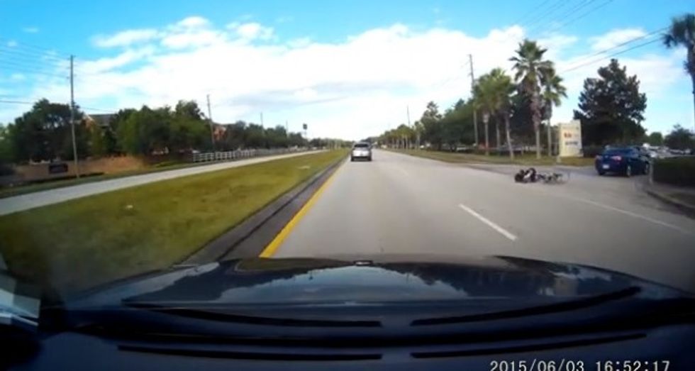 In this case, the dashcam footage showed a blue car turning right into a parking lot, clipping the cyclist while doing so. According to WKMG, the cyclist was well enough afterward that he declined medical treatment, but authorities are still on the hunt for the driver who left him. The video taken by the good Samaritan was enhanced to reveal the driver's license plate number.
