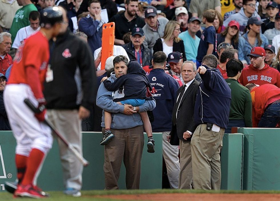 Medical personnel remove a fan injured by a broken bat in the second inning of a game in Boston's Fenway Park, June 5, 2015. (Image source: Barry Chin/The Boston Globe via Getty Images)