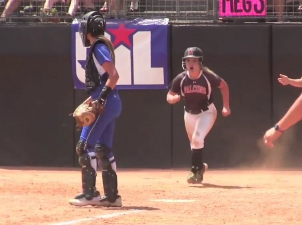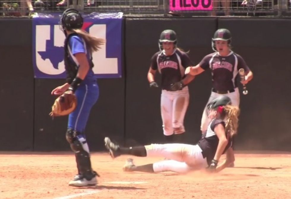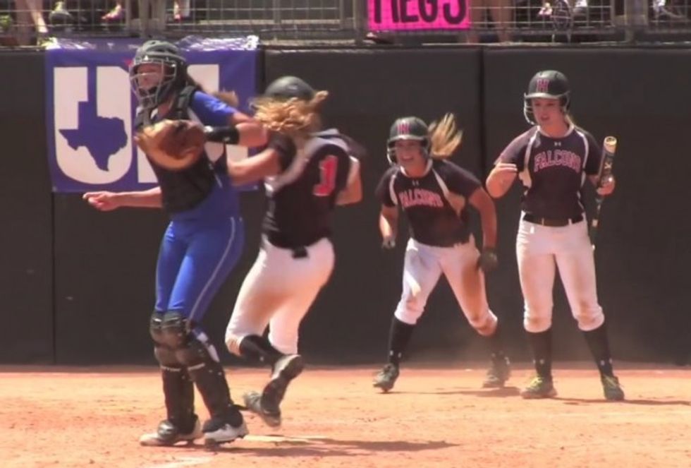 The Needville High School catcher — identified by ESPNw as Megan Crosby — threw an elbow at Huffman Hargrave High School's Demi Janak as she headed to home plate during a 4A championship game Saturday.