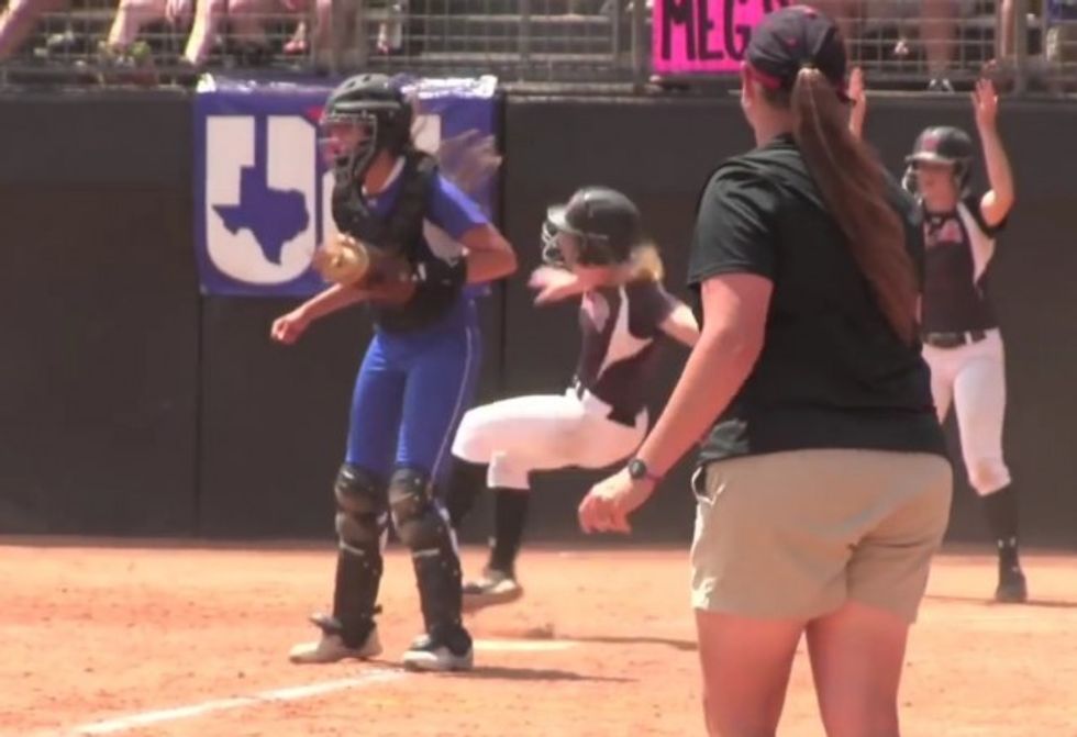 A Texas high school softball catcher was caught on a now-viral video elbowing — and toppling — runners trying score during a championship game.