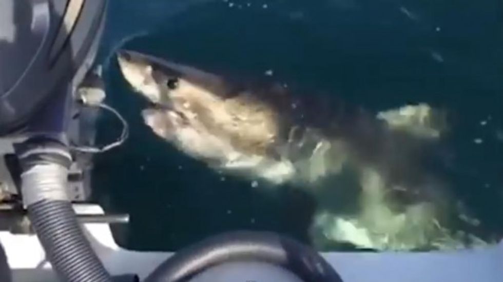 But it wasn't the fisherman the shark was after. Rather, it was their boat's engine.