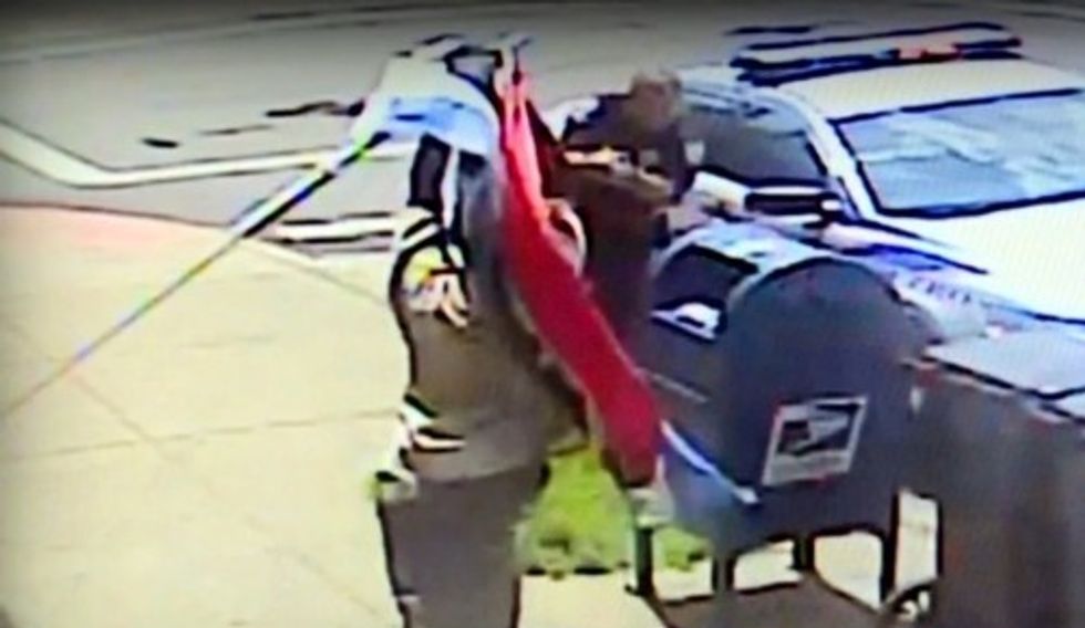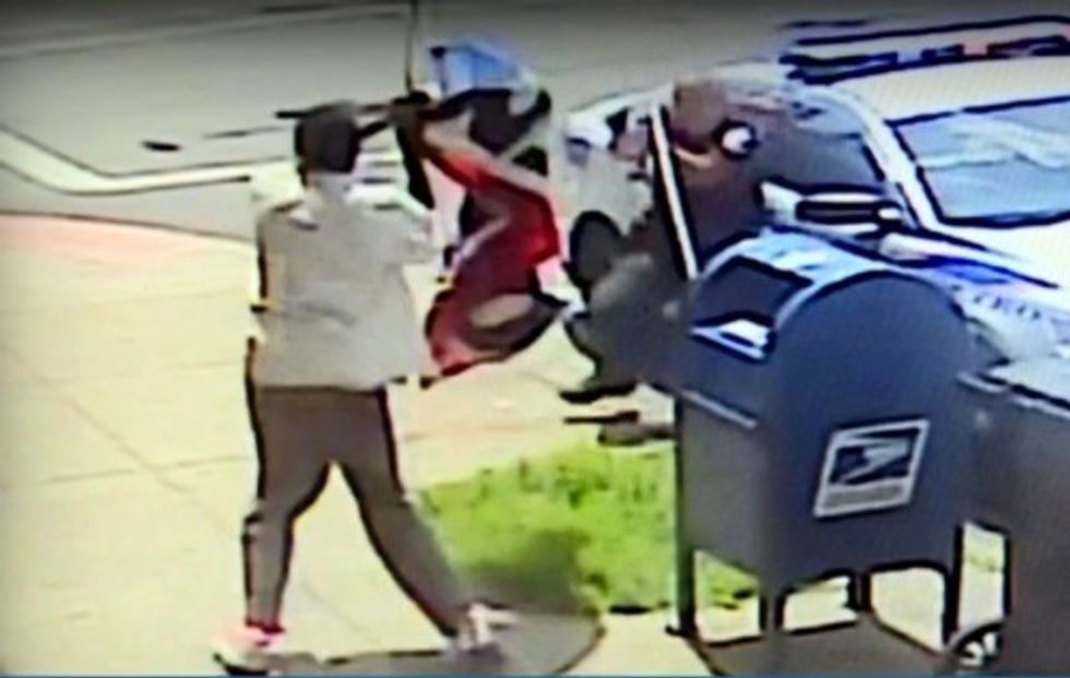 The video, which was broken down into segments, shows the officer take a few steps forward, pull his gun and appear to call for backup before the man advances toward him swinging the flag pole. At one point the flag pole breaks.