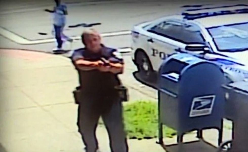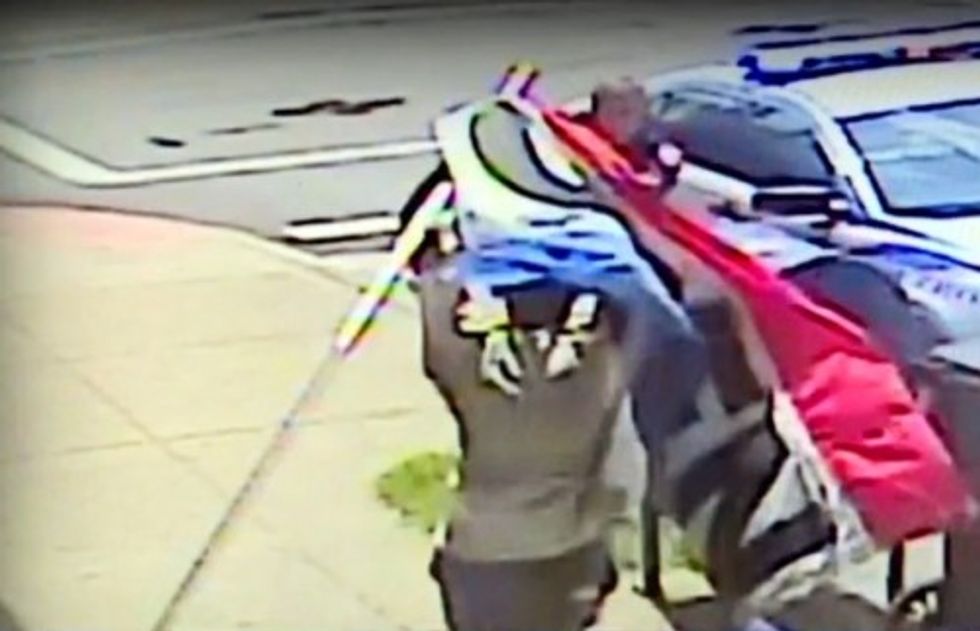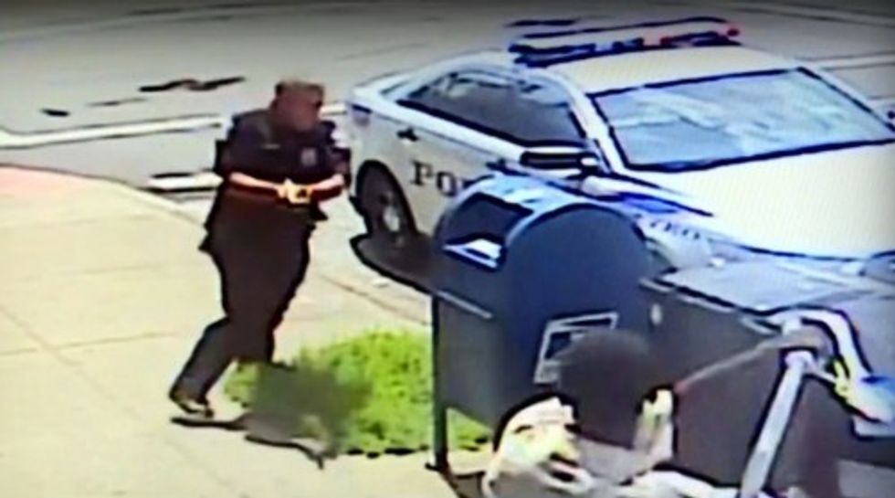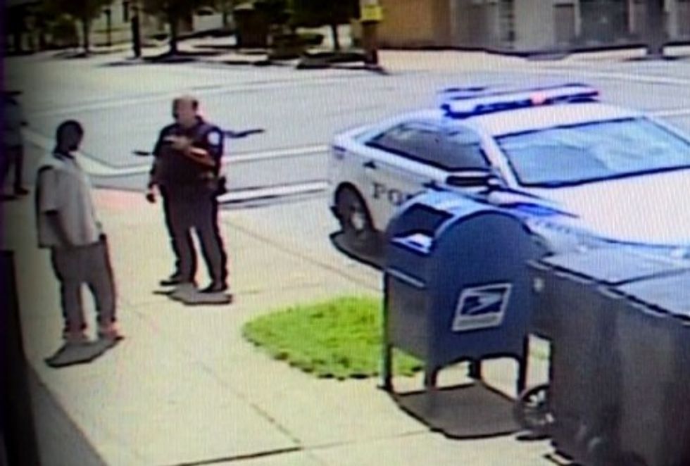 Police said the officer responded to an assault call Saturday in Old Louisville, a neighborhood near downtown Louisville. The video WHAS-TV said it got from a nearby smoke shop shows the officer talking briefly with the man, who seems to become agitated and walks away from the officer.