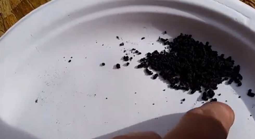 Cody pressed his still wet gunpowder mixture through a mesh sieve to make it into pellets. (Image source: YouTube)