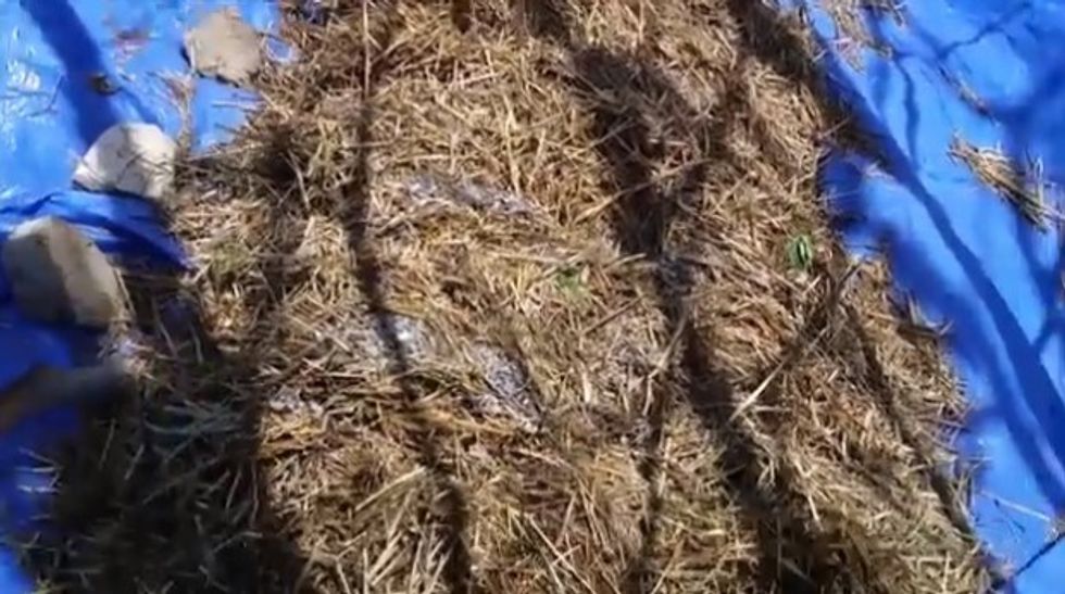 On a tarp, Cody laid down a pile of straw and added crushed limestone to it.