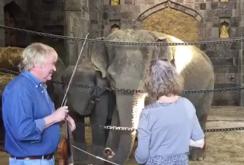 It's just a simple clip showing two violinists, reportedly from Belgium's Royal Chamber Orchestra, playing some classical music for a family of elephants.