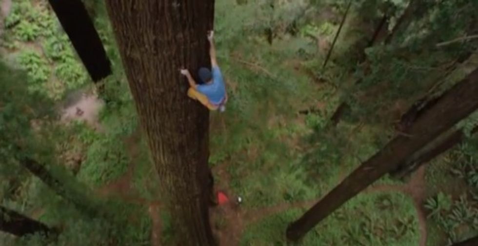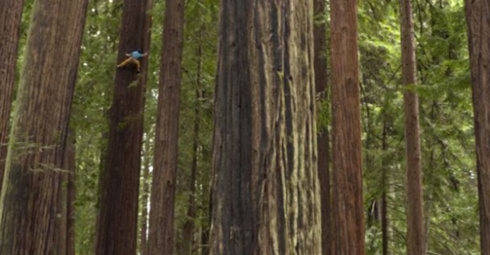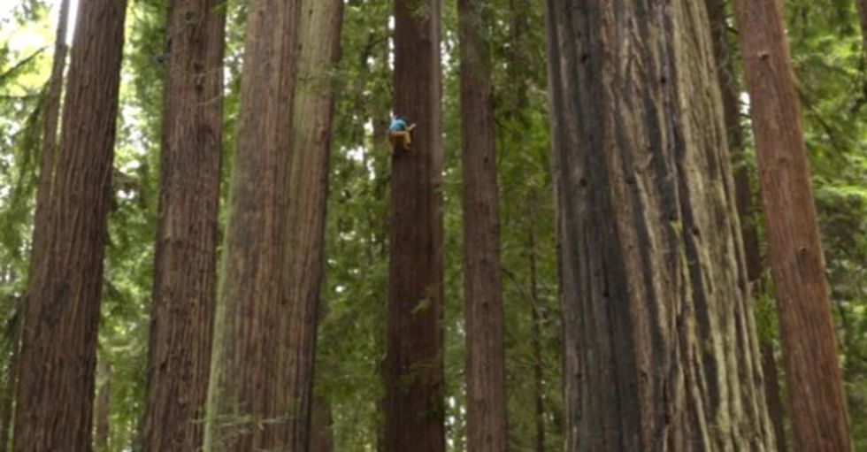 Sharma took on a 252-foot redwood tree in California. When you look at footage of the ascent, the size of the trees absolutely dwarfs him.